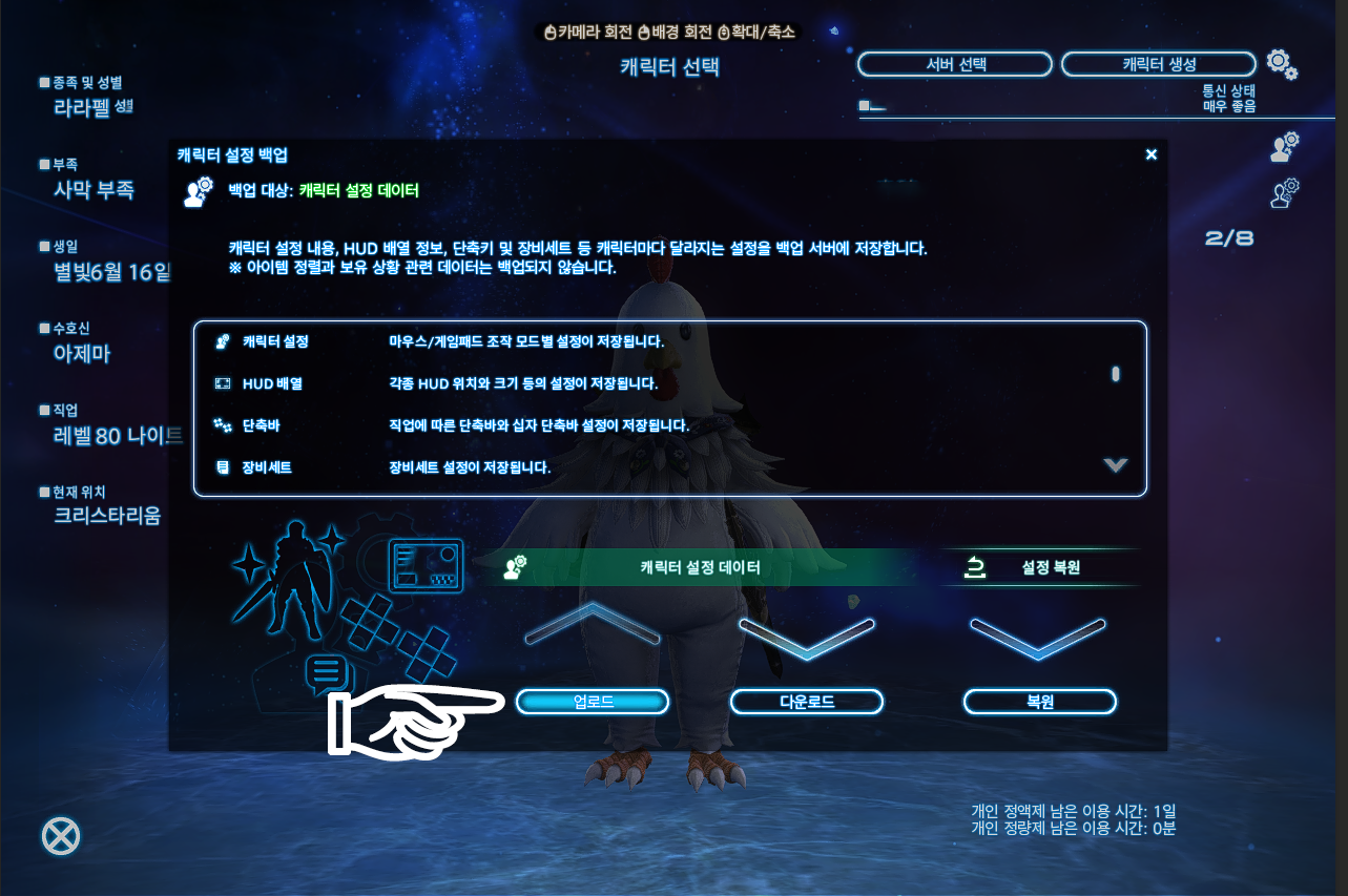 백업해둔 허드랑 캐릭터 정보를 다운 받고 싶을땐 복원을 누르자.